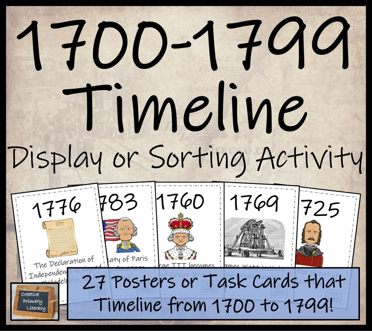 The posters look great as a display in the classroom and the cards are a brilliant introduction to the 1700s and students looking into the American Revolutionary War, the French Revolution, or the history of Europe and Great Britain. The displays and cards come both with dates and without dates, so the students can research the dates online before sorting the timeline. The cards look even better when laminated.