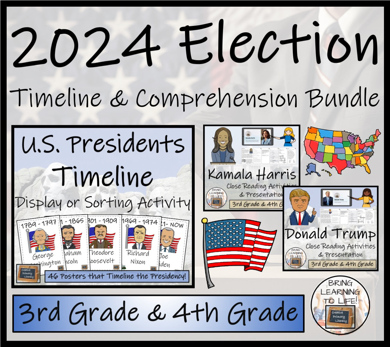 These 2024 election resources for third and fourth grade include close reading activities on Kamala Harris and Donald Trump, helping students improve comprehension while learning about key figures. A U.S. Presidents timeline activity also offers an interactive way to explore American leaders from history, making these materials perfect for engaging students during the election.