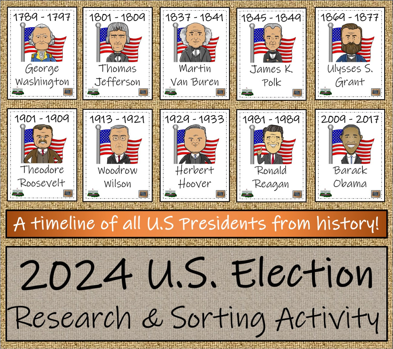 Secondly, there is a great timeline activity that is perfect for introducing students to all of the U.S Presidents throughout history. Great for class work, distance learning and home schooling. There are 46 posters or cards of all of the U.S Presidents, starting with the very first, George Washington, up until present day president, Joe Biden.