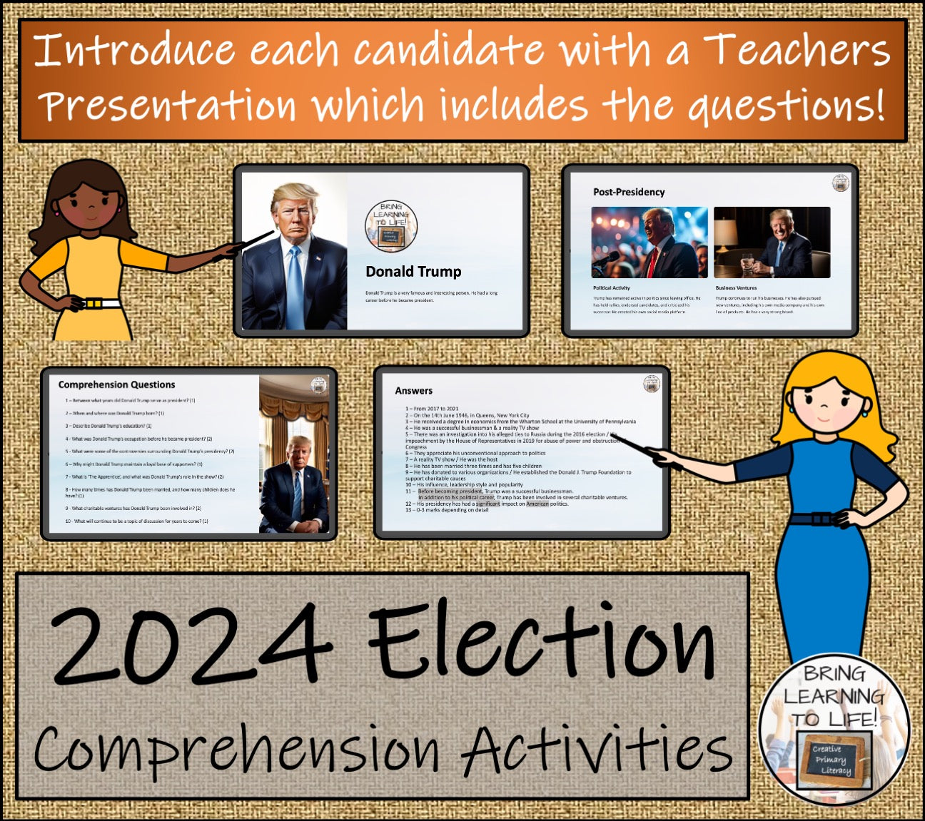 Firstly, there are two close reading passages about both Kamala Harris and Donald Trump. Each includes a teacher presentation, comprehension and grammar questions, a multiple choice quiz, a crossword puzzle and a wordsearch.