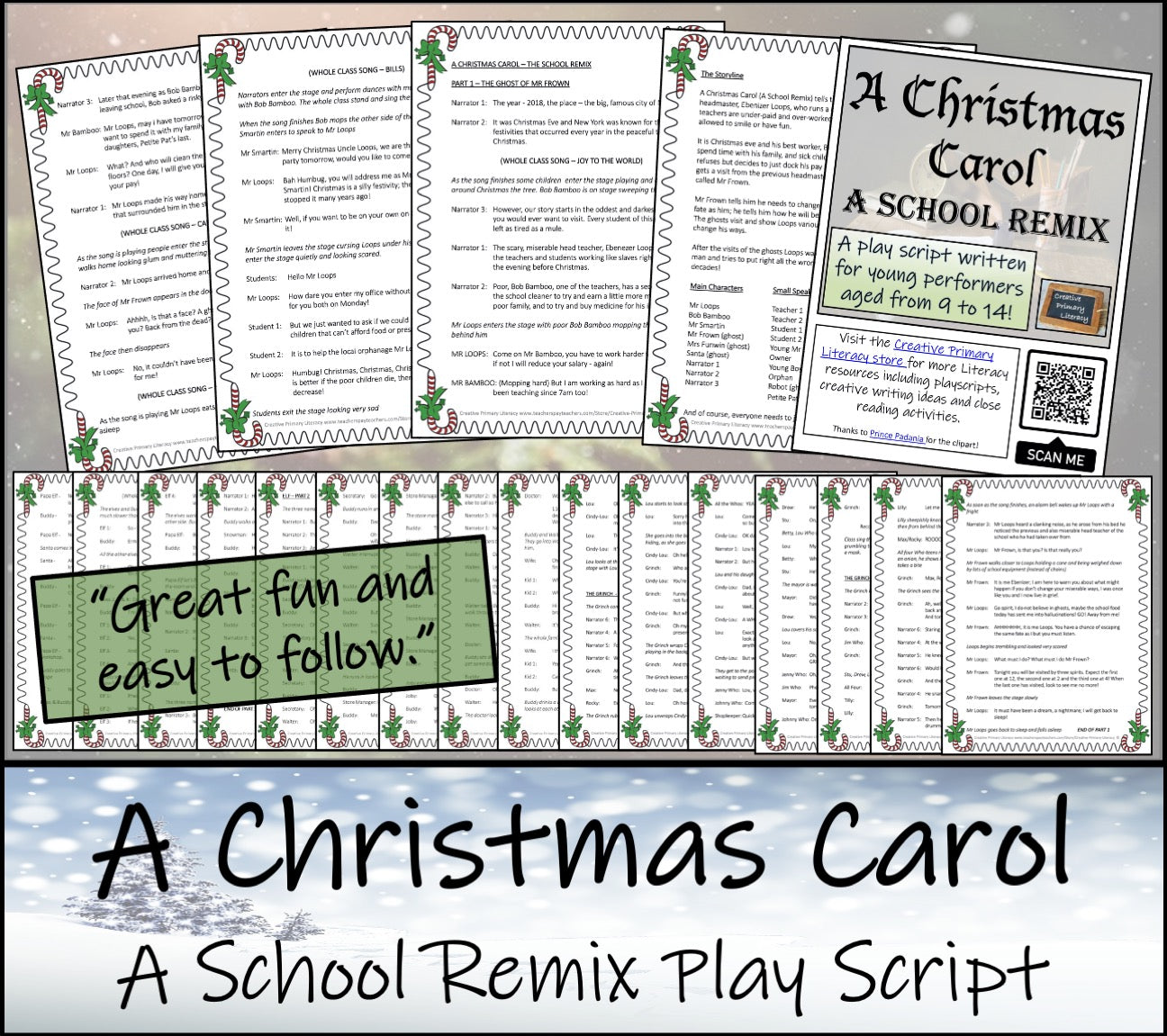 This is a play script for A Christmas Carol, however it is a modern remake that is based in a school. The play script tells the story of a mean, old headmaster, Ebenezer Loops, who runs a dark and miserable school. The teachers are under-paid and over-worked, and the students are not allowed to smile or have fun.