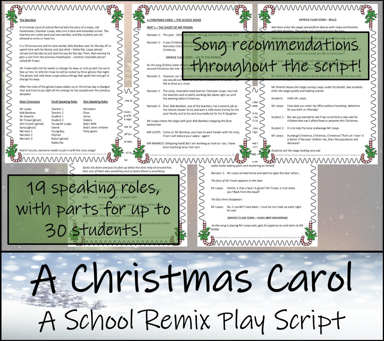 There are song recommendations throughout the script, with a mixture of traditional Christmas songs and modern songs. There are 19 speaking parts, with additional non-speaking roles too for up to 30 students.
