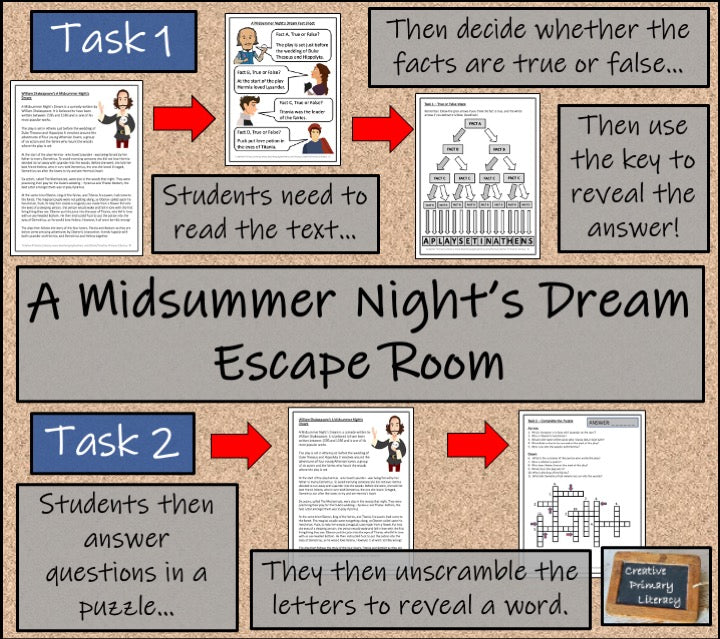 In Task 1 students will read an informational text about A Midsummer Nights Dream and then find their way through a maze by answering true or false comprehension questions. If they answer the questions correctly they will reveal their first word.