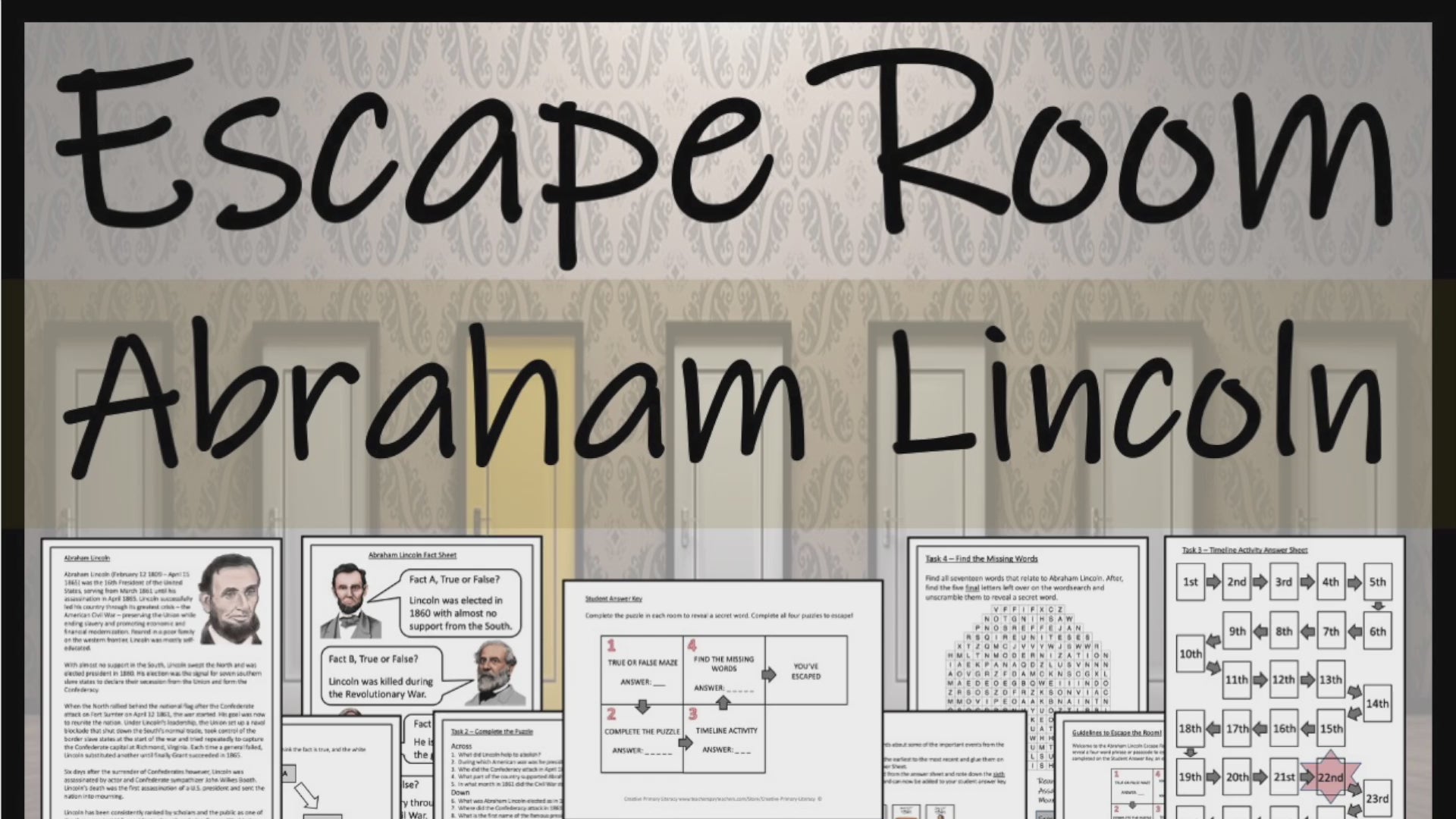 An Abraham Lincoln Escape Room activity. Ideal for fifth grade or sixth grade, the activity is perfect for group work, Presidents Day, an American Civil War topic, team-building activities or for a fun, engaging and interactive lesson. The activity can be used in English class as it incorporates some ELA skills or in Social Studies.