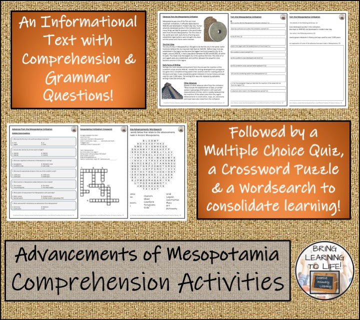 A close reading passage with a teacher presentation, comprehension and grammar questions, a multiple choice quiz, a crossword puzzle and a wordsearch about the huge advancements that were made in Ancient Mesopotamia.