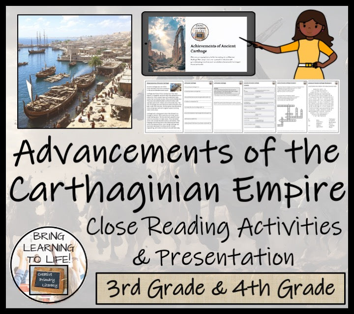 A close reading passage with a teacher presentation, comprehension and grammar questions, a multiple choice quiz, a crossword puzzle and a wordsearch about the advancements made in the Ancient Carthaginian Empire.