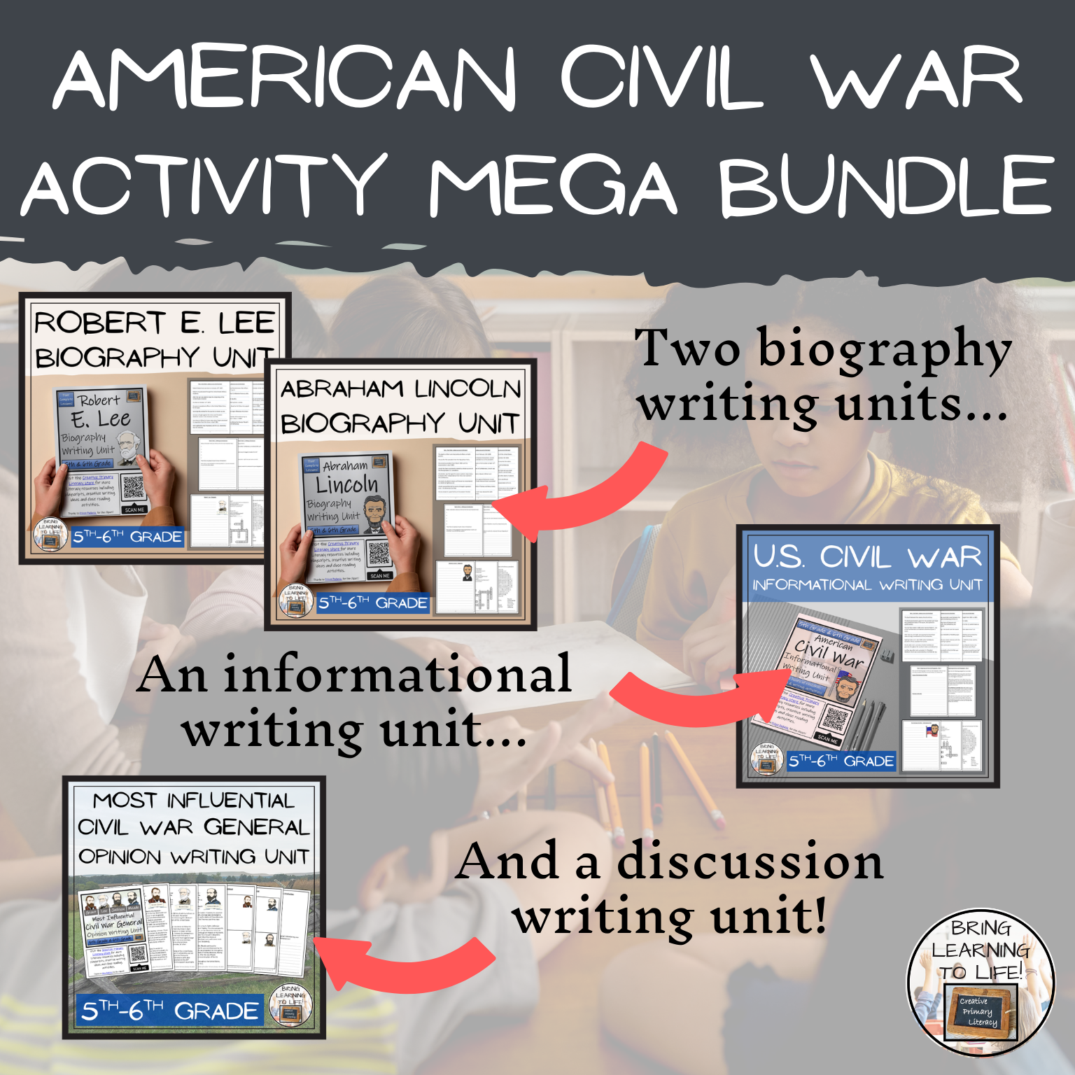 This bundle contains a timeline display and sorting activity, fourteen close reading activities about key events and figures from the Civil War; two biography writing units about Abraham Lincoln and Robert E. Lee; a discussion-based writing activity about who was the most influential general of the war; an informational writing unit; and two escape room activities to enhance your students knowledge even further.