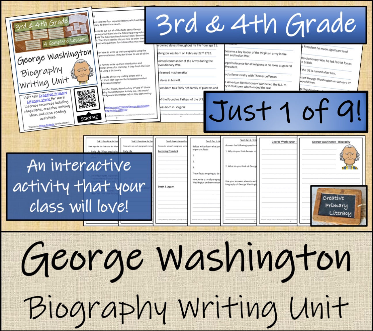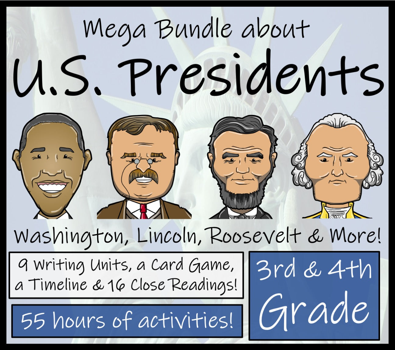 The bundle focuses on some of the most influential U.S. Presidents throughout American history. The bundle contains sixteen close reading activities; eight biography writing units; an opinion writing unit; a timeline activity and display; and an interactive card game your students will love. The activities are perfect for students in third grade or fourth grade.