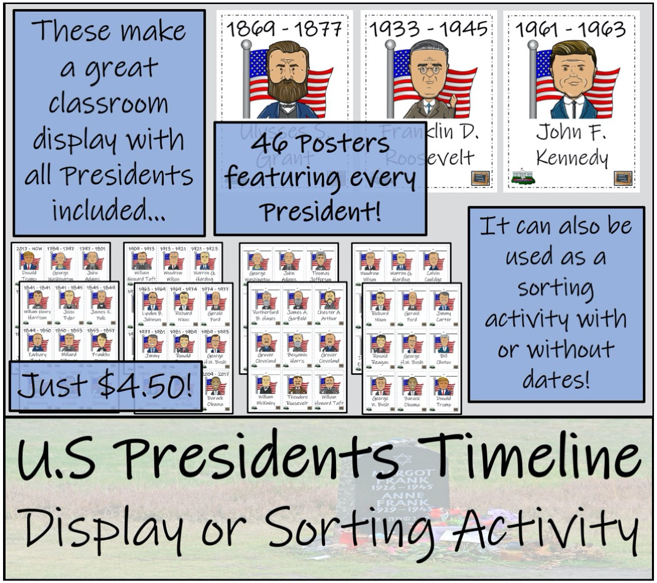 Then, a great classroom display and sorting activity that is perfect for introducing students to all of the U.S Presidents throughout history. Great for class work, distance learning and home schooling. There are 46 posters or cards of all of the U.S Presidents, starting with the very first, George Washington, up until present day president, Joe Biden.