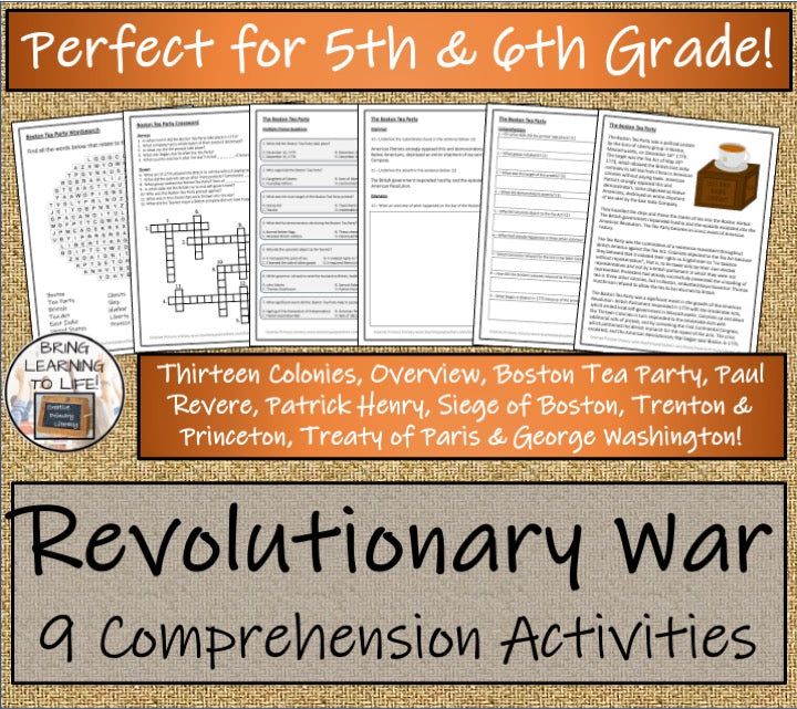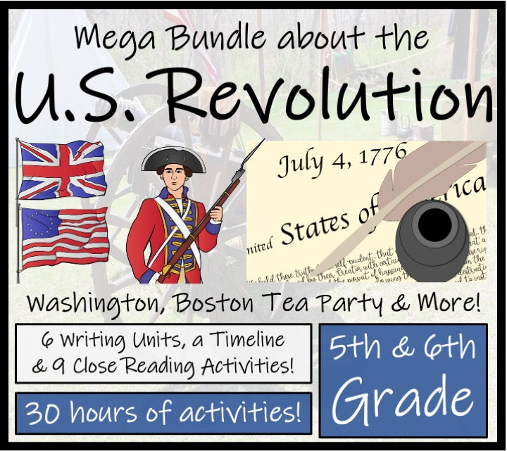 This bundle contains nine close reading activities that timeline the American Revolutionary War; a display and timeline activity; three biography writing units about George Washington, Thomas Jefferson & George III; three informational text writing units about the War of Independence, the Boston Tea Party and the Treaty of Paris; and an opinion writing unit about the most influential founding father.