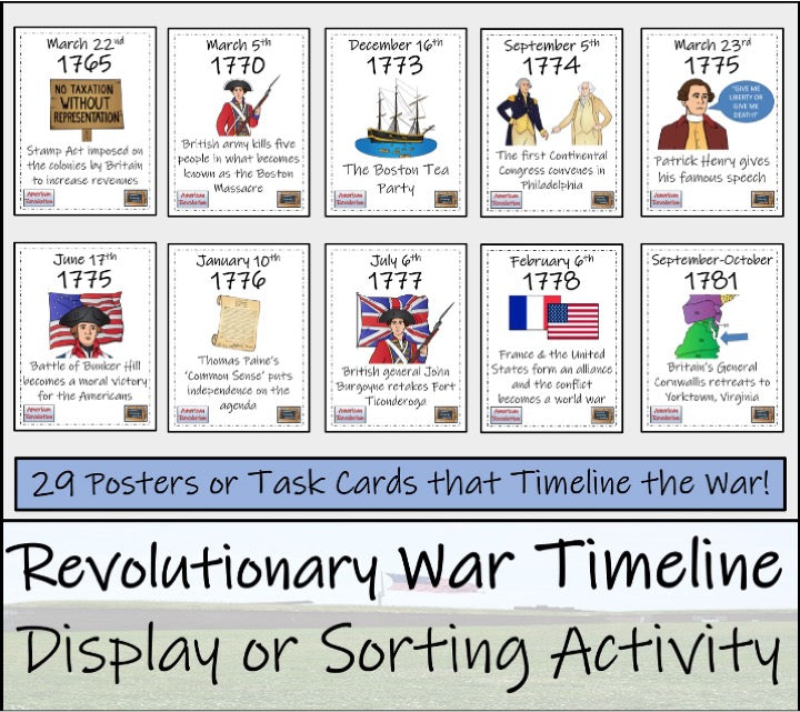 Also included is a great classroom display and sorting activity that is perfect for introducing students to some of the key events of the American Revolution. Great for class work, distance learning or home schooling. There are 29 posters or task cards that include many of the key figures and events from the Boston Tea Party to the Treaty of Paris which formally ended the war.