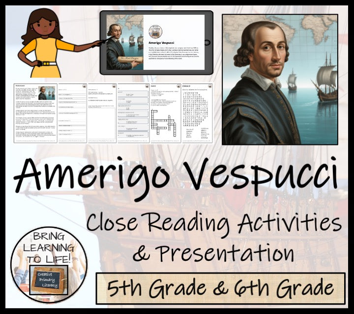 A close reading passage with a teacher presentation, comprehension and grammar questions, a multiple choice quiz, a crossword puzzle and a wordsearch about the explorer who played an important role in discovering that the lands found by Columbus were part of a new continent, not Asia, Amerigo Vespucci.