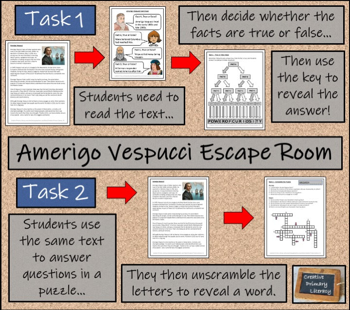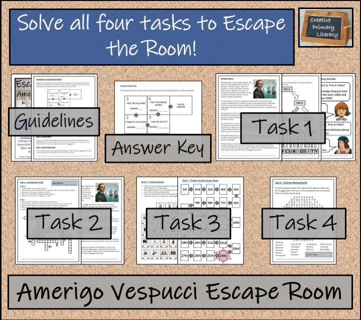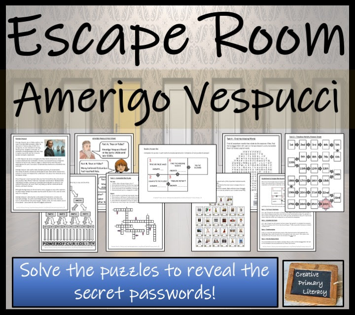An Escape Room activity about the explorer who played an important role in discovering that the lands found by Columbus were part of a new continent, not Asia, Amerigo Vespucci. Ideal for fifth grade or sixth grade, the activity is perfect for group work, starting a new topic, team-building activities or for a fun, engaging and interactive lesson. The activity can be used in English class as it incorporates some ELA skills or in Social Studies.
