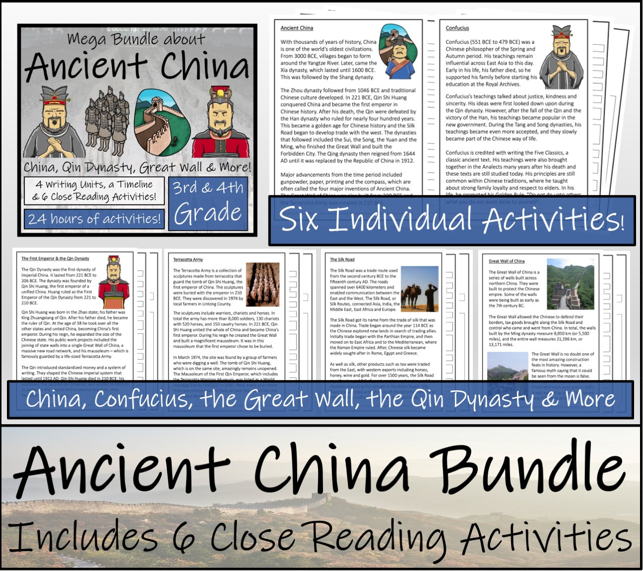 This bundle contains six close reading activities about key events from Ancient China and influential people from the era; a timeline display or sorting activity; two biography writing units about Confucius and Qin Shi Huang; an informational writing unit about Ancient China and an opinion writing unit discussing the most important development from the period.
