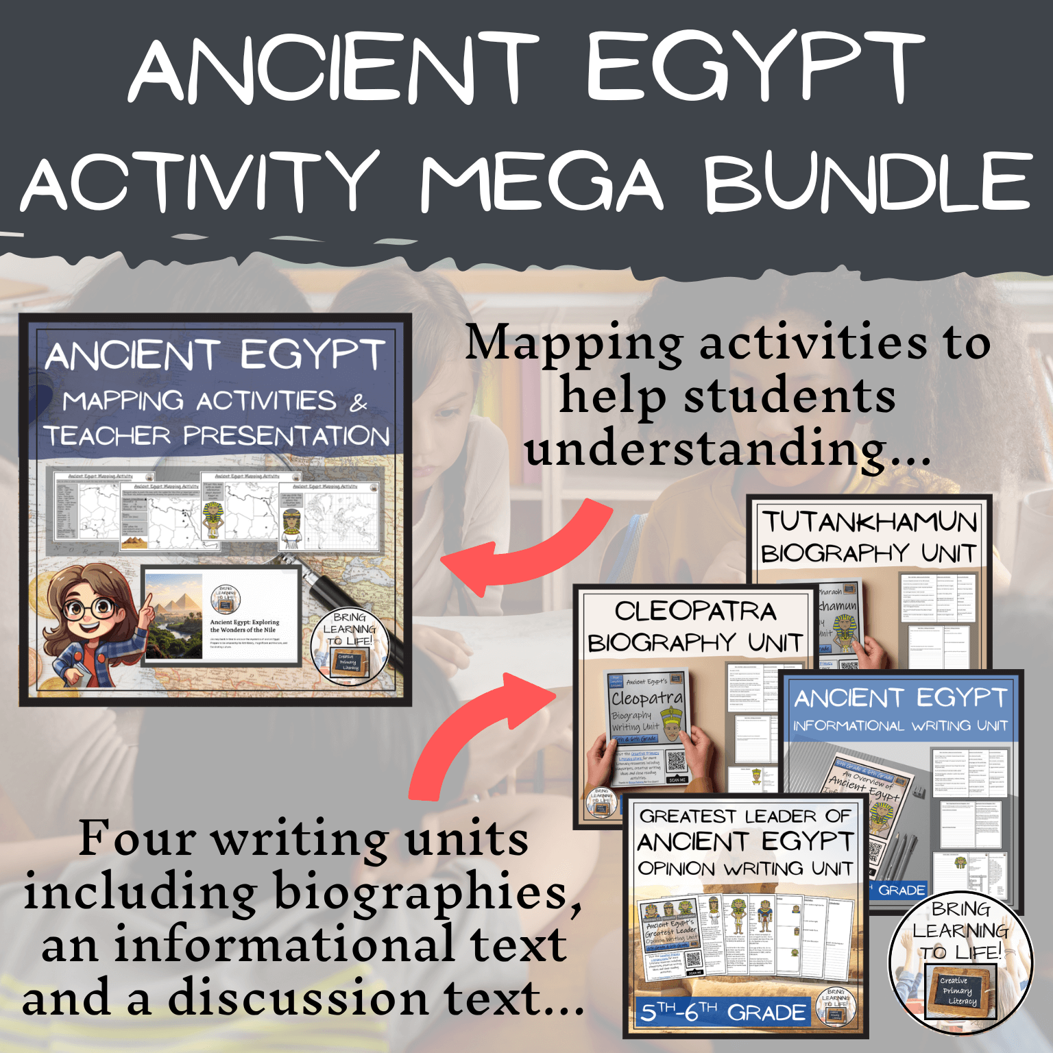 This bundle contains five close reading activities about Ancient Egypt and influential people from the era; a timeline display or sorting activity; two biography writing units about Cleopatra and Tutankhamun; a discussion based writing unit about the greatest leader from the time; mapping activities to understand the geography of the civilization; an informational writing unit about Ancient Egypt; and two escape room activities to enhance your students knowledge even further.