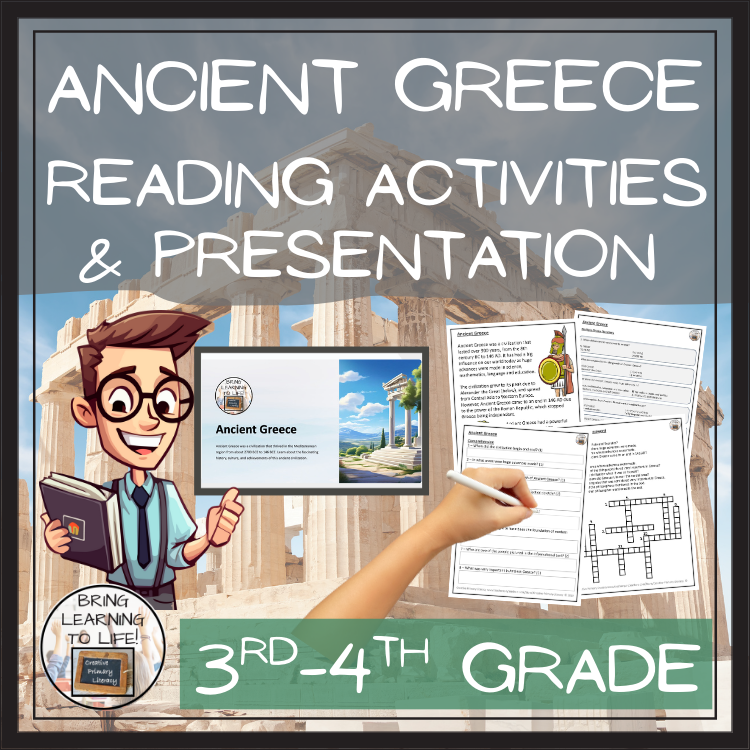 A close reading passage with an informational text, a teacher presentation, comprehension and grammar questions, a multiple choice quiz, a crossword puzzle and a wordsearch about Ancient Greece.