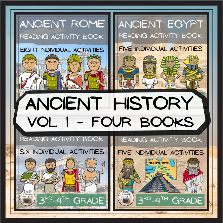 A bundle of four close reading books consisting of twenty-three close reading passages about famous events or figures from Ancient Mesopotamia, Ancient Greece, Ancient Egypt and Ancient Rome.