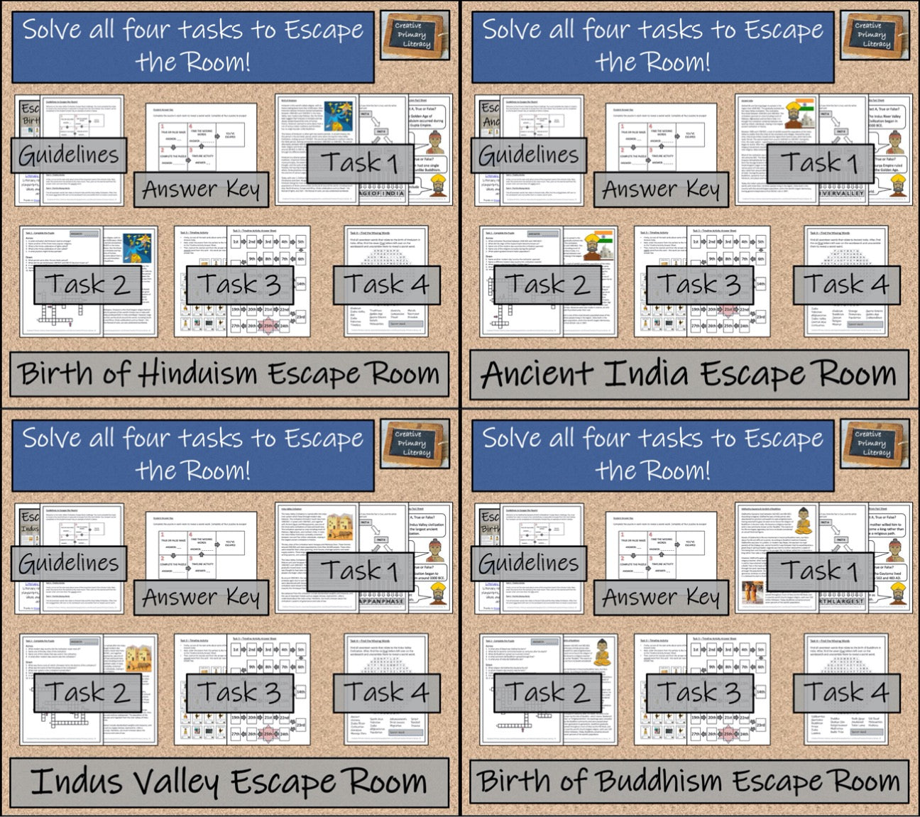 Four individual Ancient India Escape Room activities about the following famous figures or periods from history: