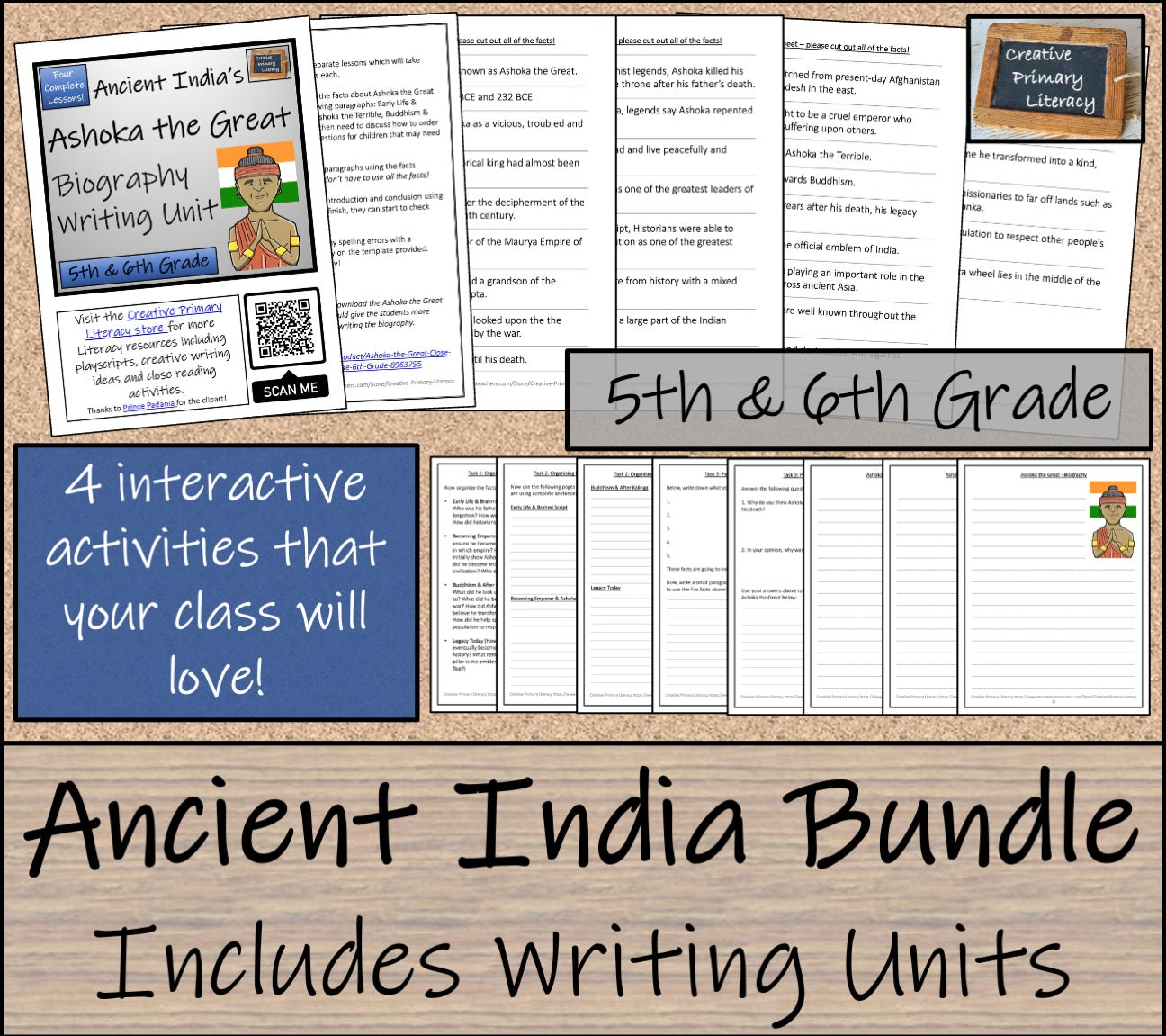 This bundle contains six close reading activities about key events from Ancient India and influential people from the era; a timeline display or sorting activity; two biography writing units about Ashoka the Great and Siddhartha Gautama; an informational writing unit about Ancient India and an opinion writing unit discussing the most influential figure from the history of India.