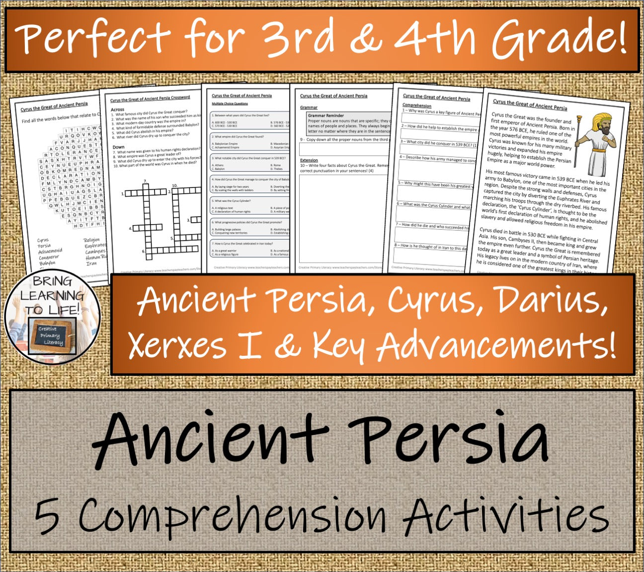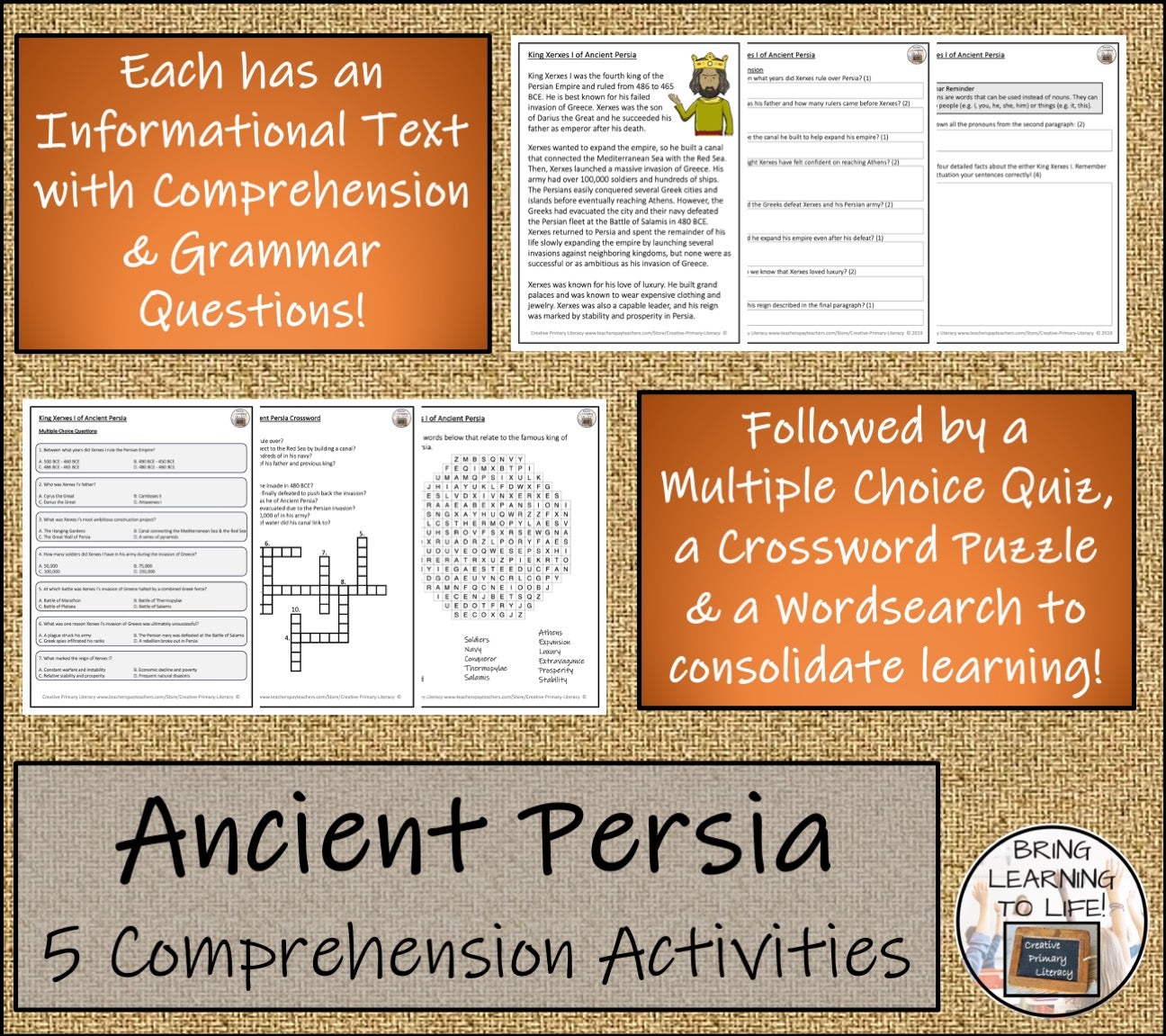 A bundle with five close reading passages focused on the key events and people of Ancient Persia, each with a teacher presentation, comprehension and grammar questions, a multiple choice quiz, a crossword puzzle and a wordsearch