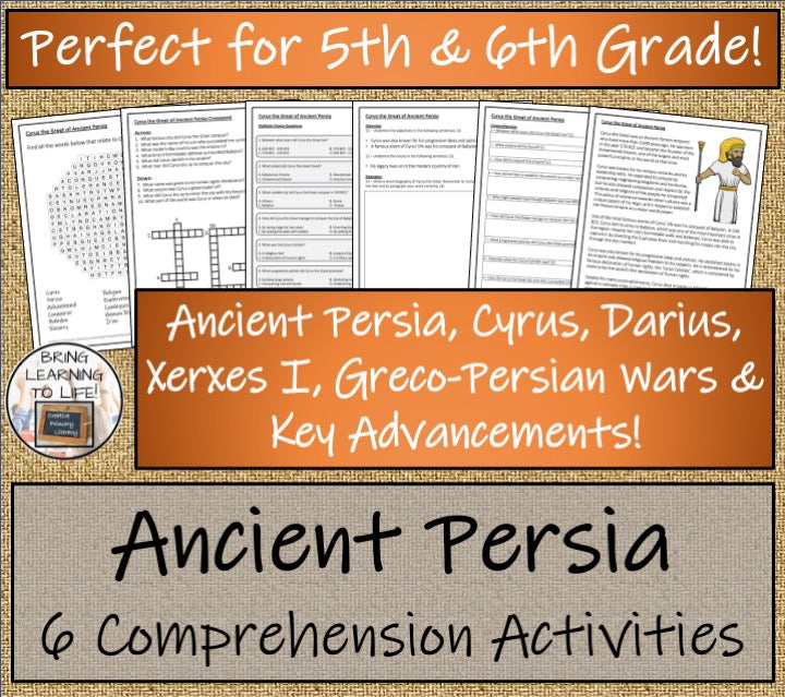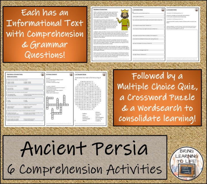 A bundle with six close reading passages focused on the key events and people of Ancient Persia, each with a teacher presentation, comprehension and grammar questions, a multiple choice quiz, a crossword puzzle and a wordsearch