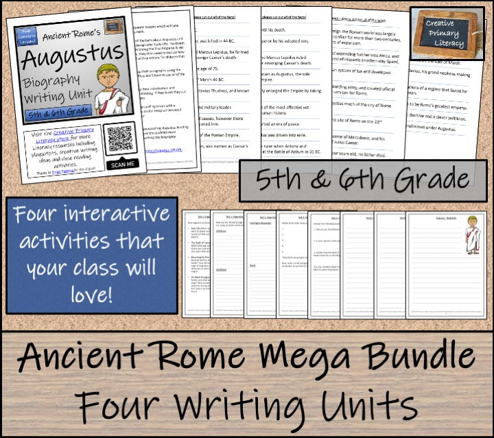 This bundle contains eleven close reading activities about Ancient Rome and influential people from the era; a timeline display or sorting activity; an Ancient Rome mapping activity; two biography writing units about both Julius Caesar and Augustus; a discussion based writing activity about the greatest leader from the time; and an informational writing unit about Ancient Rome.