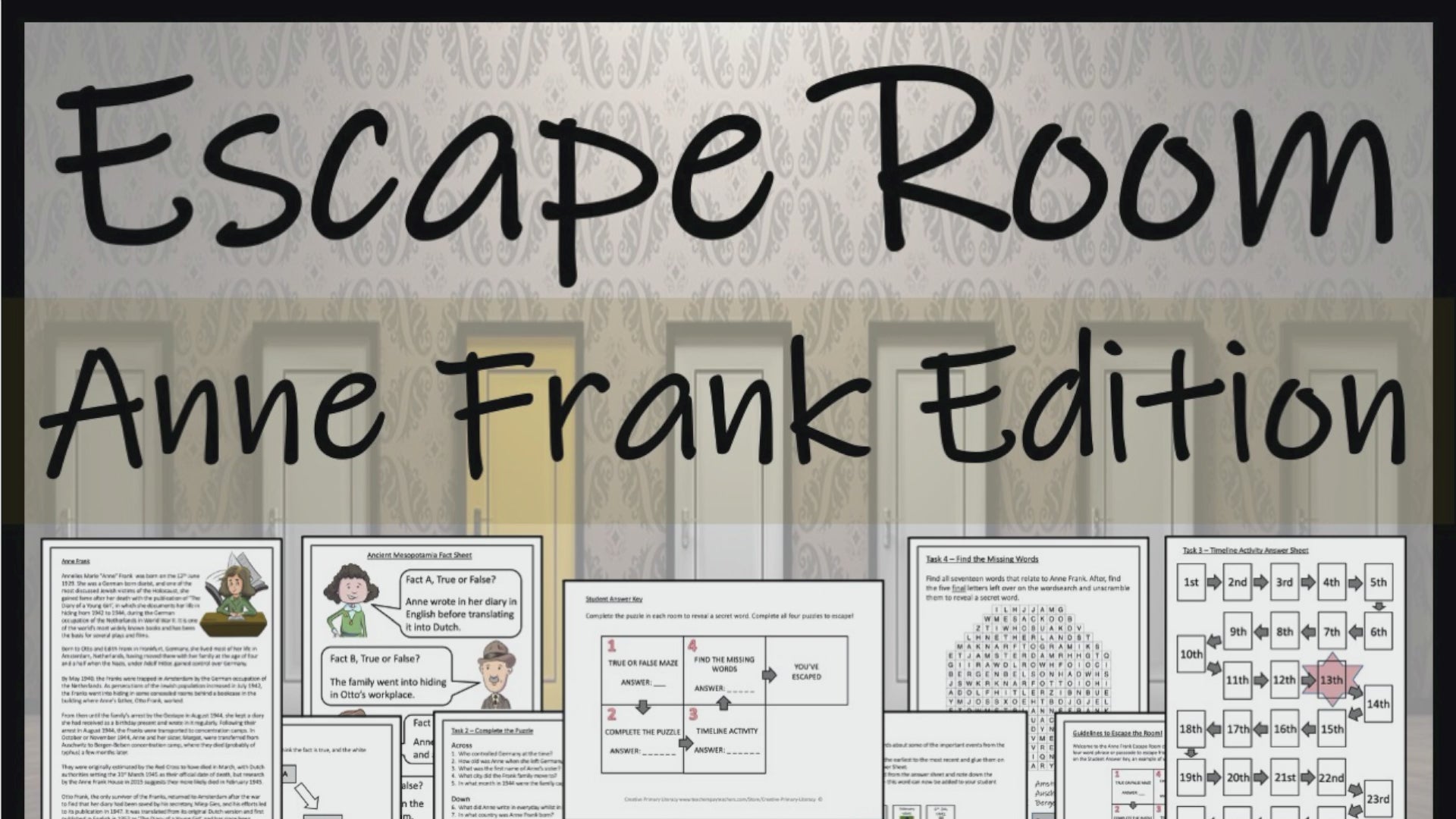 An Anne Frank Escape Room activity. Ideal for fifth grade or sixth grade, the activity is perfect for group work, starting a new World War II or Holocaust topic, team-building activities or for an engaging and interactive lesson. The activity can be used in English class as it incorporates some ELA skills or in Social Studies.