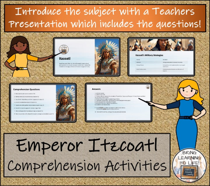 A free close reading passage with an informational text, a teacher presentation, comprehension and grammar questions, a multiple choice quiz, a crossword puzzle and a wordsearch about the influential emperor of the Aztec Empire, who formed the powerful Triple Alliance, Itzcoatl.