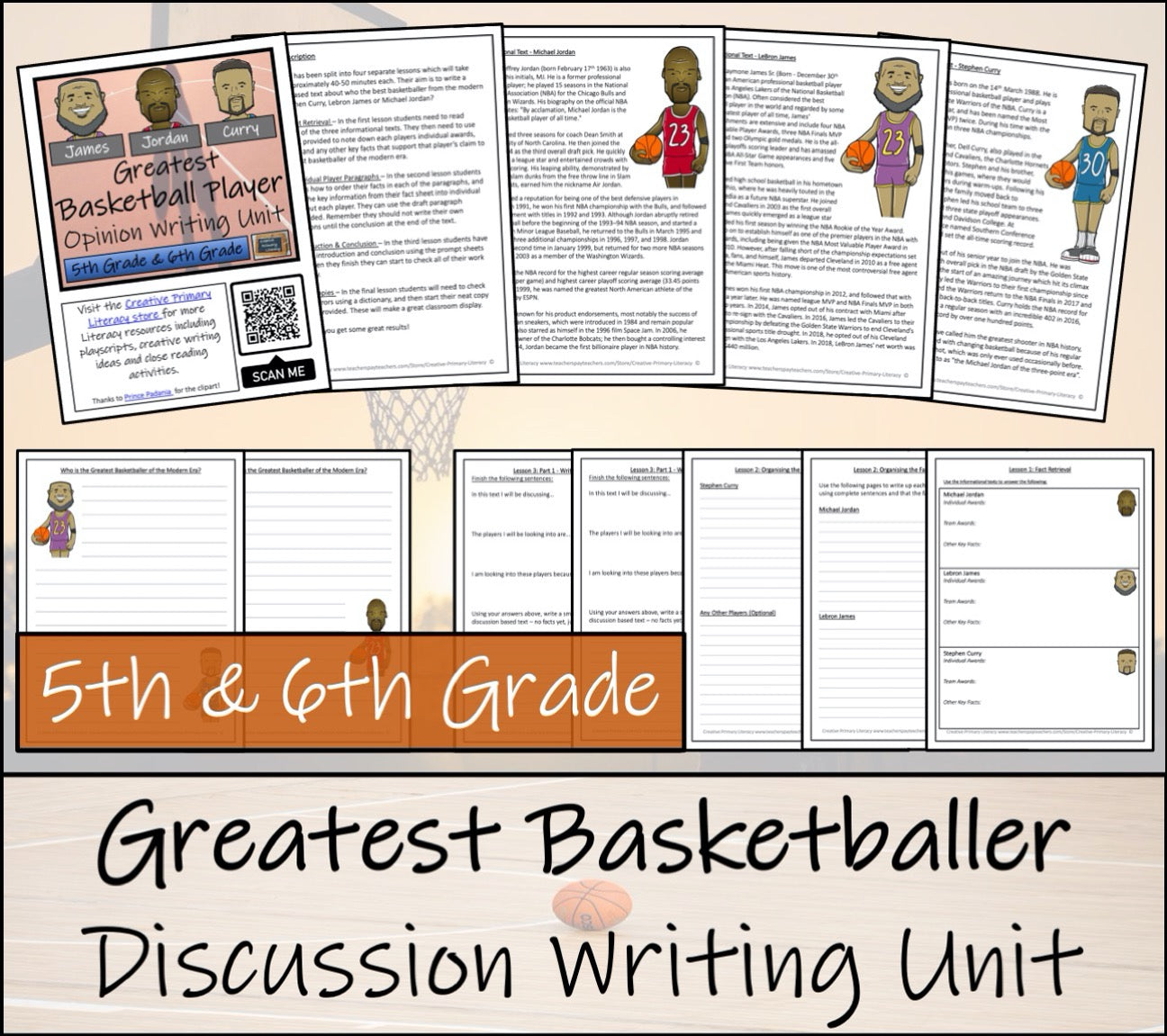Finally, there is a discussion based writing unit discussing who is the greatest modern day basketball player. The unit has been split into four separate lessons which will take students approximately 40-50 minutes each.