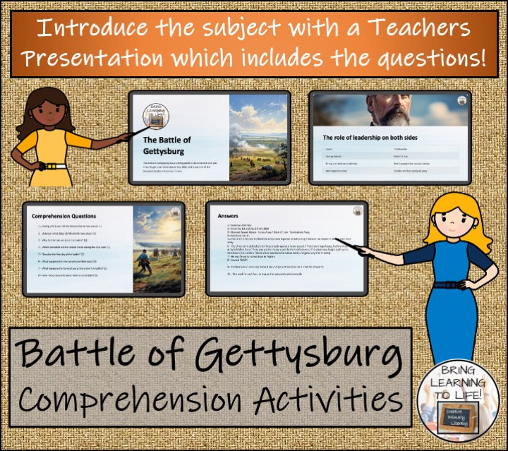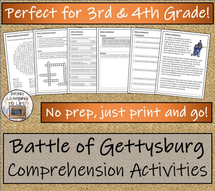A close reading passage with a teacher presentation, comprehension and grammar questions, a multiple choice quiz, a crossword puzzle and a wordsearch about the Battle of Gettysburg which proved to be a pivotal battle in the American Civil War.