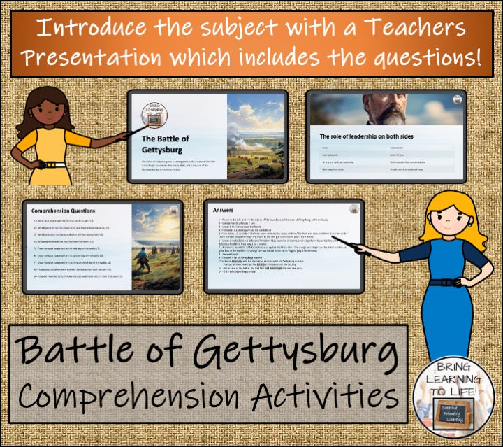 A close reading passage with a teacher presentation, comprehension and grammar questions, a multiple choice quiz, a crossword puzzle and a wordsearch about the Battle of Gettysburg which proved to be a pivotal battle in the American Civil War.