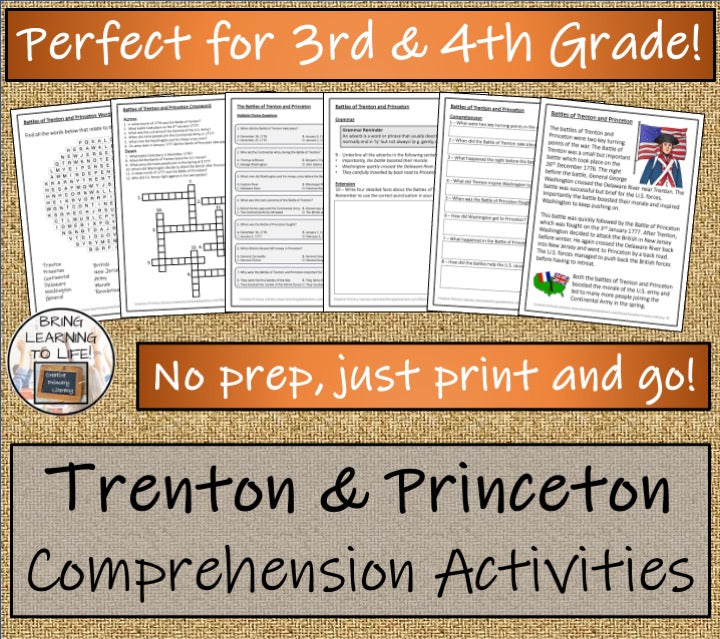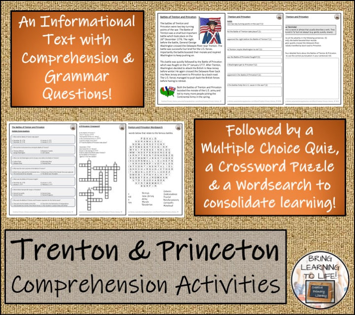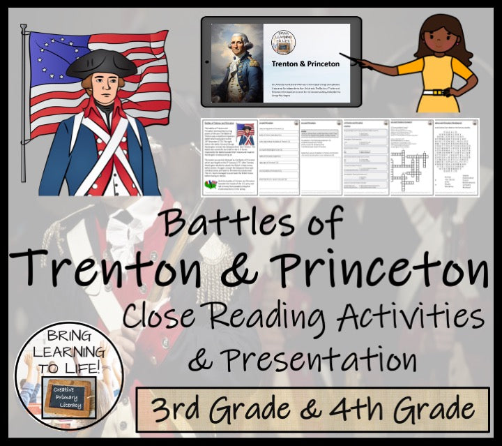 A close reading passage with a teacher presentation, comprehension and grammar questions, a multiple choice quiz, a crossword puzzle and a wordsearch that about the famous battles of Trenton and Princeton that turned the tide of the American Revolutionary War.