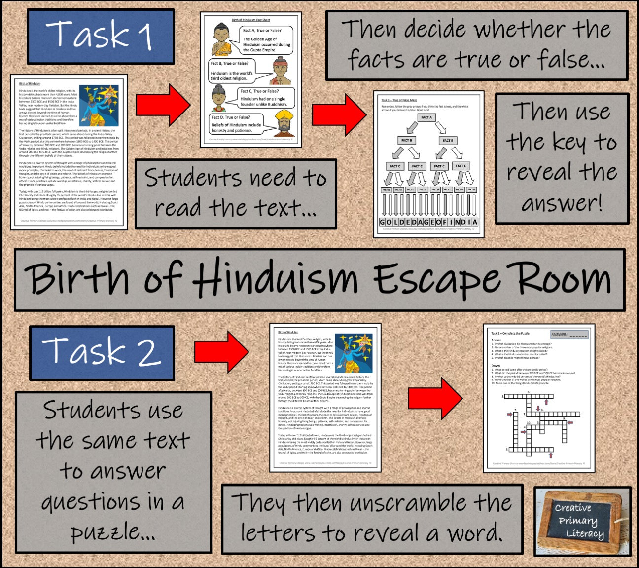 In Task 1 students will read an informational text about Ancient India and the birth of Hinduism and then find their way through a maze by answering true or false comprehension questions. If they answer the questions correctly they will reveal their first word.