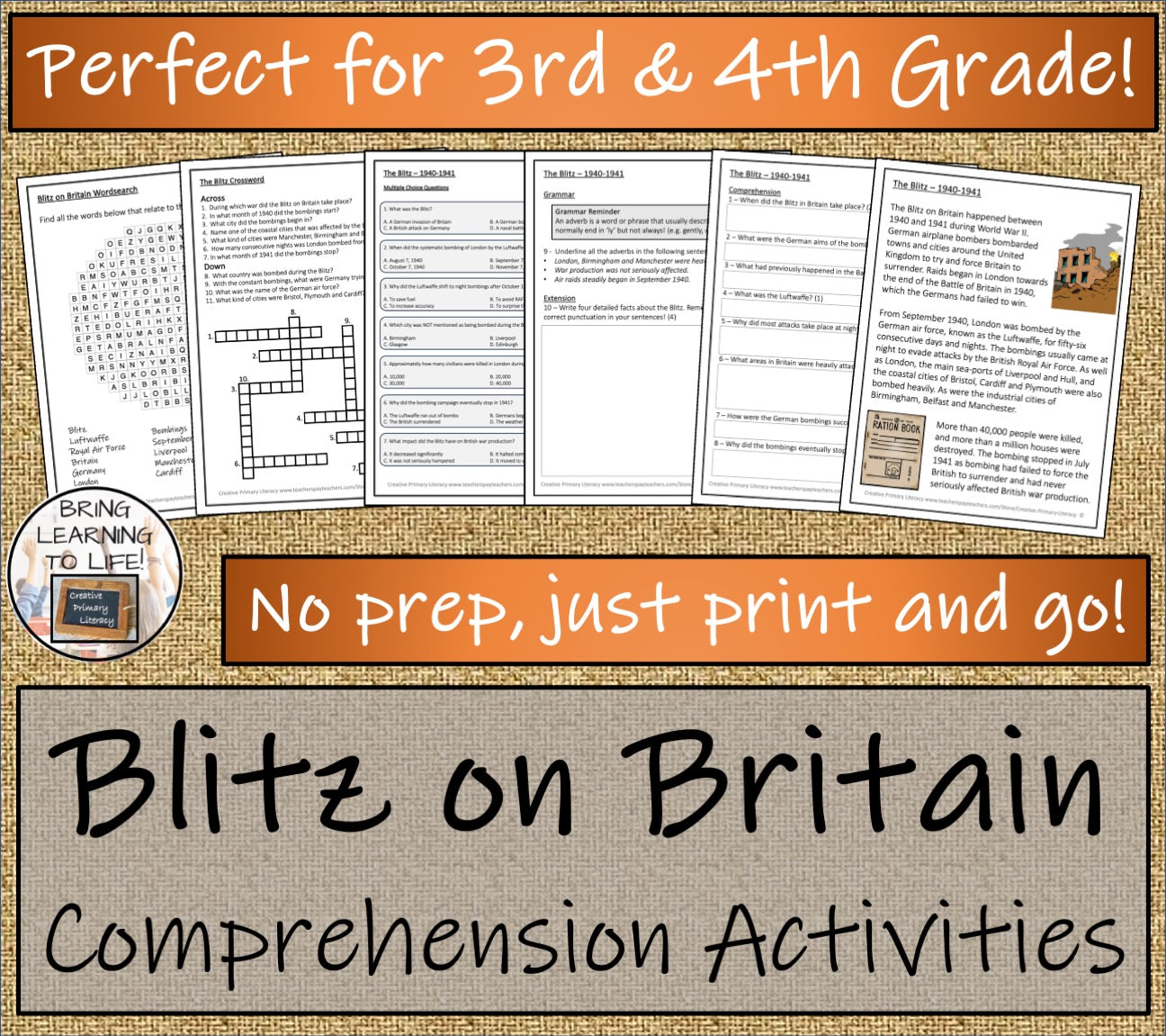 A World War 2 close reading passage with a teacher presentation, comprehension and grammar questions, a multiple choice quiz, a crossword puzzle and a wordsearch about the famous German Blitz on Britain during World War II.