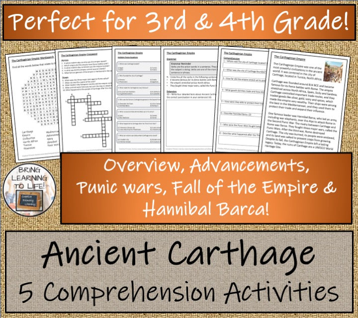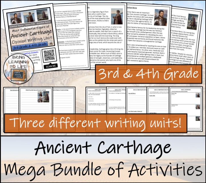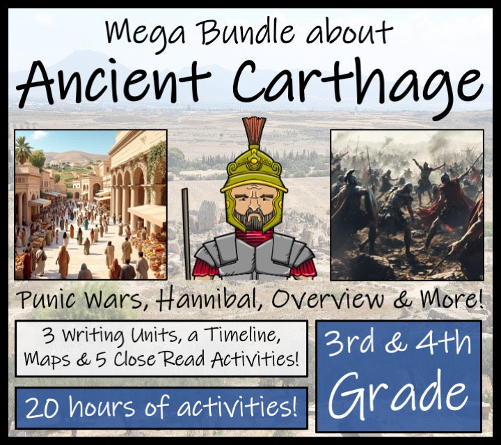 This bundle contains five close reading activities about the Carthage Empire and the Punic Wars; a timeline display and sorting activity; a biography writing unit about Hannibal; an informational writing unit about the Empire, an opinion writing unit discussing the most influential figure, and an Ancient Carthage map activity.