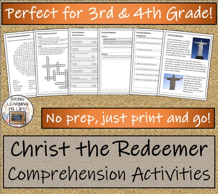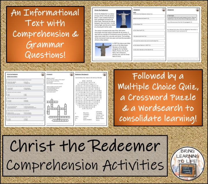 A free close reading passage with a teacher presentation, comprehension and grammar questions, a multiple choice quiz, a crossword puzzle and a wordsearch about the Christ the Redeemer statue in Rio de Janeiro, which is one of the New Seven Wonders of the World.