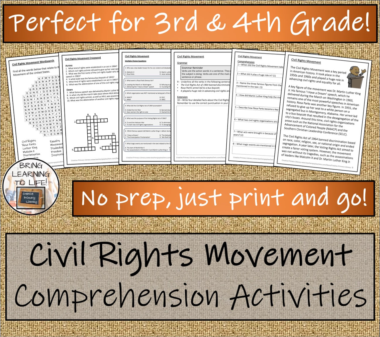 The NO PREP informational text worksheets are perfect for students in third grade or fourth grade for MLK Day or for Black History Month. Students will learn key facts about the Civil Rights Movement whilst working on their comprehension skills.