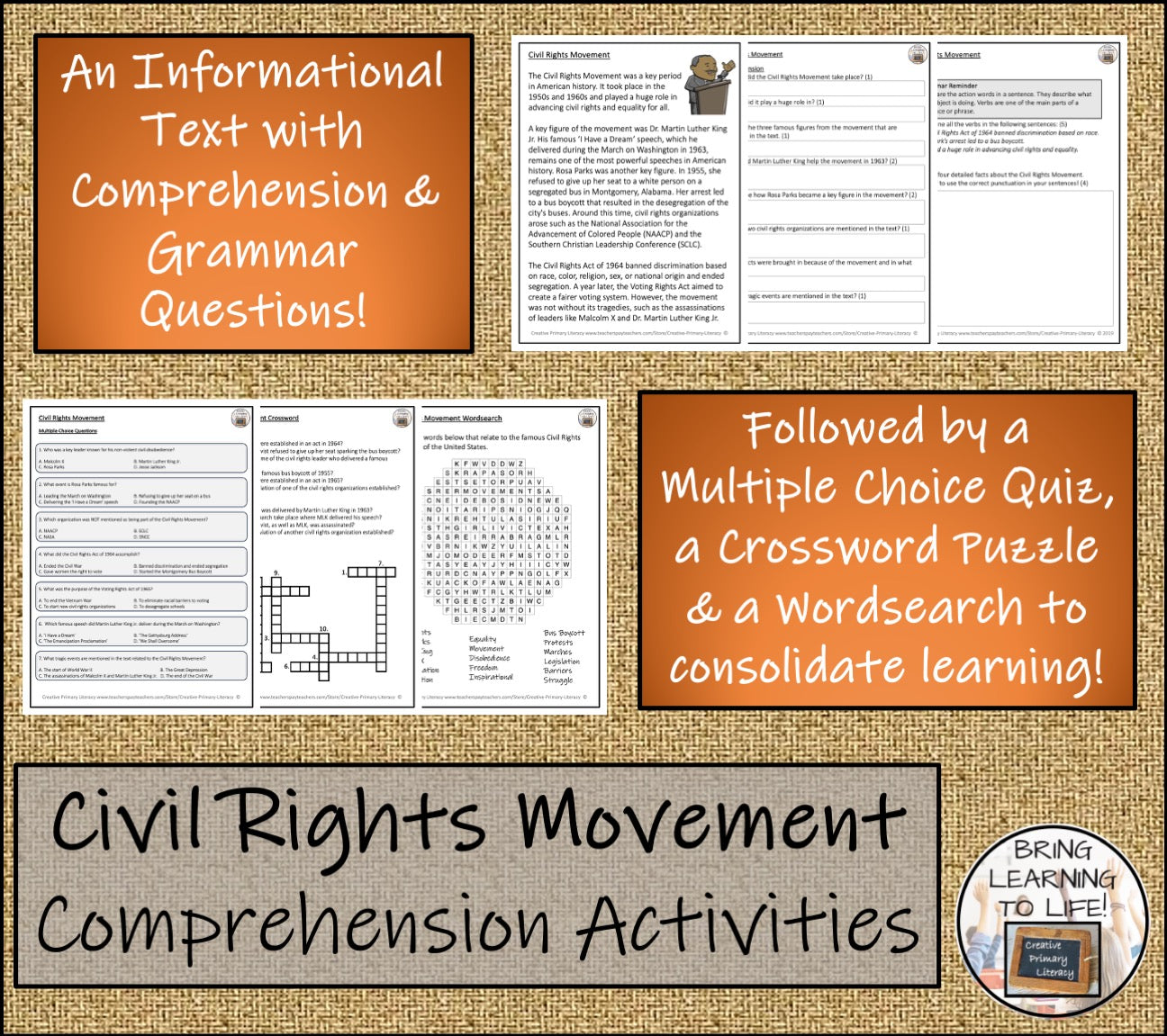 A close reading passage with a teacher presentation, comprehension and grammar questions, a multiple choice quiz, a crossword puzzle and a wordsearch about the Civil Rights Movement in the United States, including key figures such as Martin Luther King and Rosa Parks.