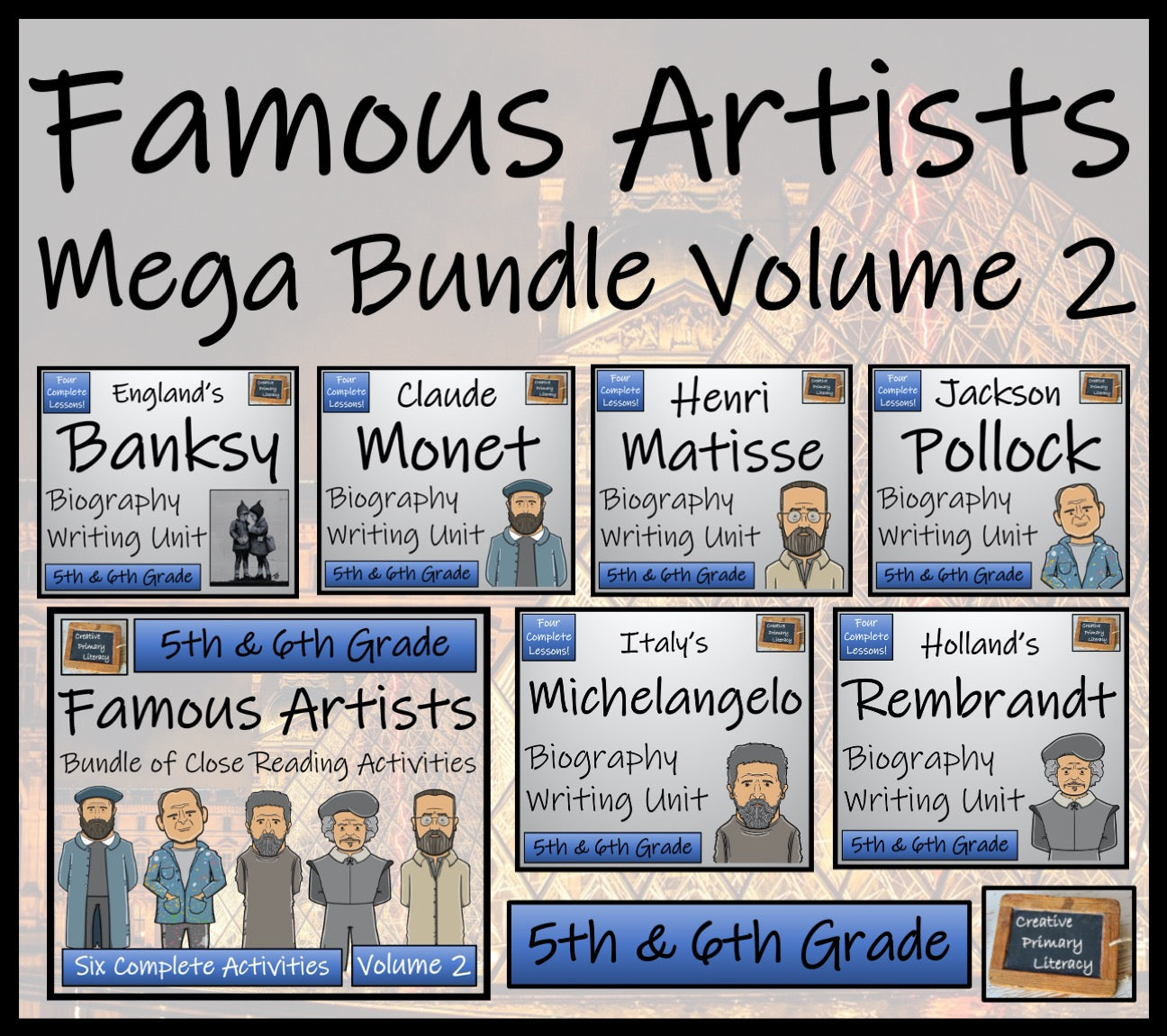 This bundle focuses on some famous artists throughout history: Rembrandt, Michelangelo, Claude Monet, Banksy, Henri Matisse and Jackson Pollock. The bundle contains six close reading activities and then six biography writing units. The activities are perfect for students in 5th grade or 6th grade.