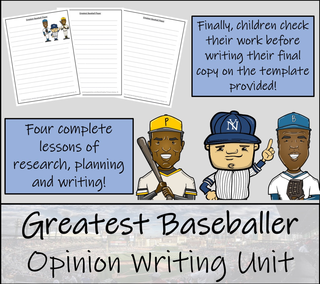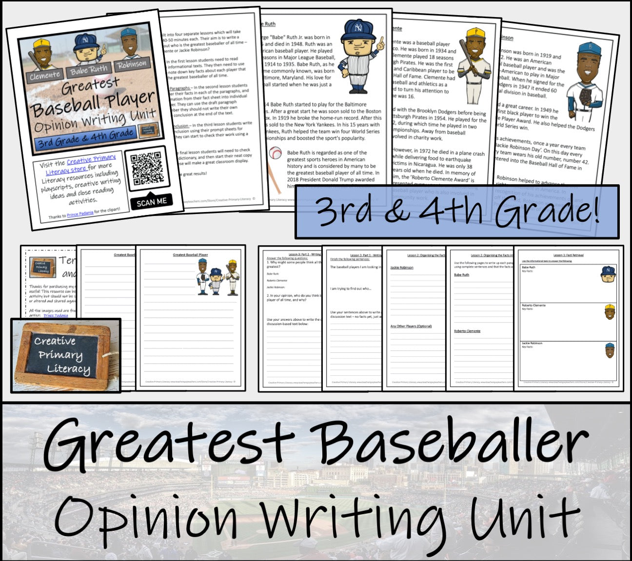 A discussion writing unit allowing students to research, discuss and write about who is the greatest baseball player of all time: Babe Ruth, Roberto Clemente or Jackie Robinson. The unit has been split into four separate lessons which and is perfect for students in third grade or fourth grade.