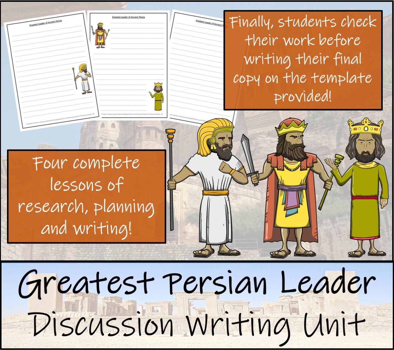 A discussion writing unit allowing children to research, discuss and write about who was the greatest leader from the history of Ancient Persia: Cyrus the Great, Darius the Great or King Xerxes I. The unit has been split into four separate lessons which and is perfect for students in fifth grade or sixth grade.