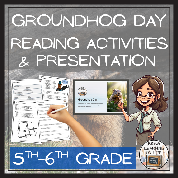 A close reading passage with a teacher presentation, comprehension and grammar questions, a multiple choice quiz, a crossword puzzle and a wordsearch about the traditions of Groundhog Day in the United States and Canada.