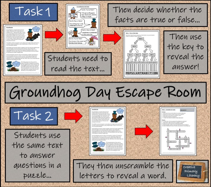 In Task 1 students will read an informational text about Groundhog Day and then find their way through a maze by answering true or false comprehension questions. If they answer the questions correctly they will reveal their first word.