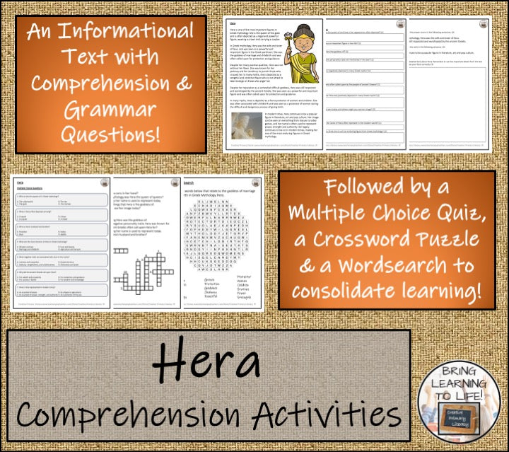 A close reading passage with a teacher presentation, comprehension and grammar questions, a multiple choice quiz, a crossword puzzle and a wordsearch about the Greek Goddess of marriage and childbirth, and the wife and sister of Zeus, Hera.