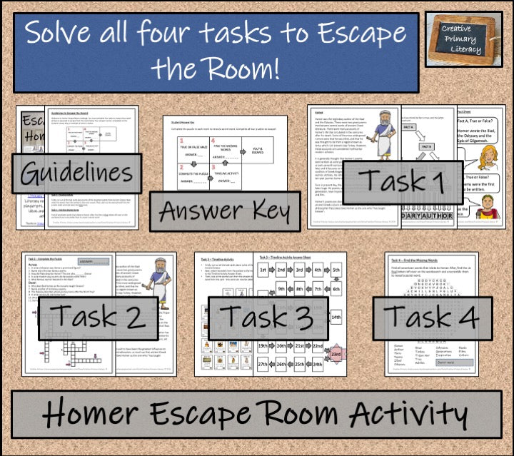 An Escape Room activity about Homer, the author of Ancient Greece famous for The Iliad and The Odyssey. Ideal for fifth grade or sixth grade, the activity is perfect for group work, starting a new ancient history topic, team-building activities or for a fun, engaging and interactive lesson. The activity can be used in English class as it incorporates some ELA skills or in Social Studies.