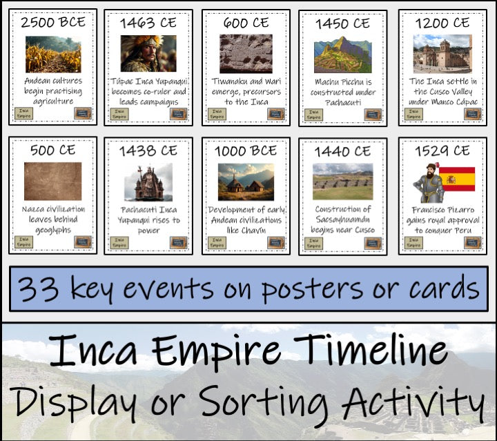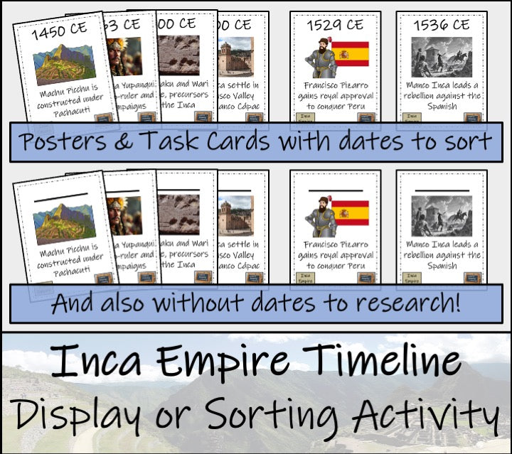 There are 33 posters or task cards that include many of the key events including the development of early settlements, the developments of Cusco and Machu Picchu, the rule of famous emperors, and the arrival of Francisco Pizarro and the Spanish conquistadors.