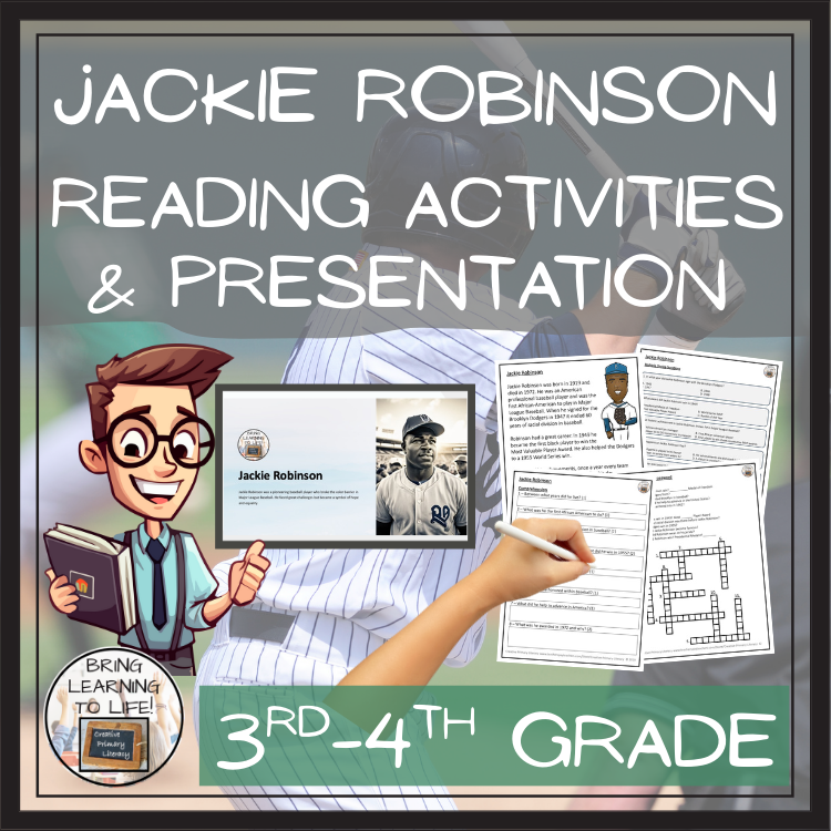 A close reading passage with a teacher presentation, comprehension and grammar questions, a multiple choice quiz, a crossword puzzle and a wordsearch about the baseball superstar and civil rights pioneer, Jackie Robinson.