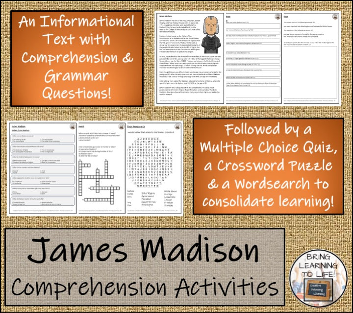 A close reading passage with a teacher presentation, comprehension and grammar questions, a multiple choice quiz, a crossword puzzle and a wordsearch about the fourth president of the United States, James Madison.