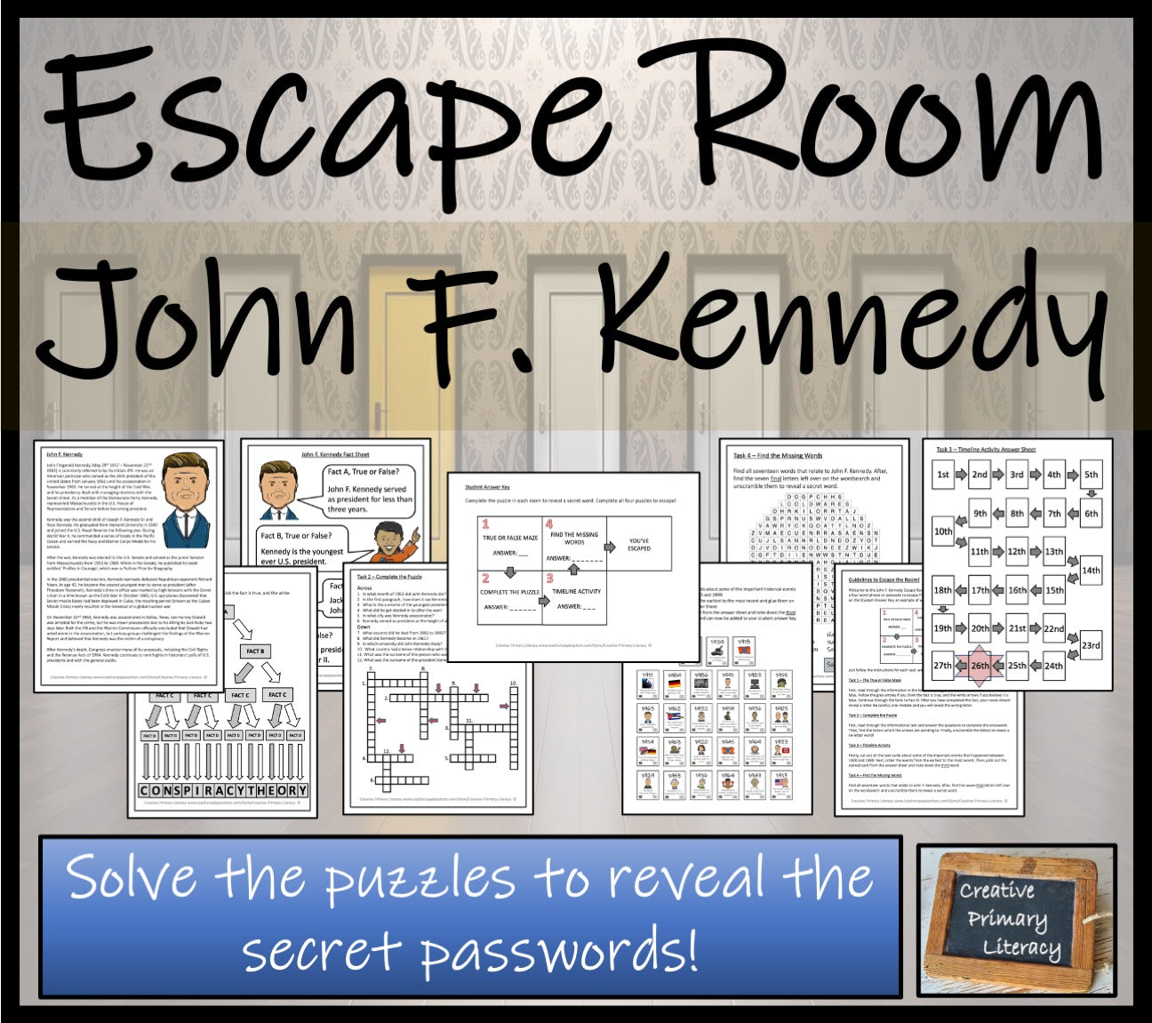 A JFK Escape Room activity. Ideal for fifth grade or sixth grade, the activity is perfect for group work, President's Day, team-building activities or for a fun, engaging and interactive lesson. The activity can be used in English class as it incorporates some ELA skills or in Social Studies.