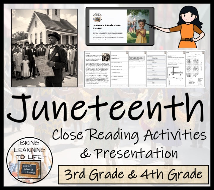 A close reading passage with a teacher presentation, comprehension and grammar questions, a multiple choice quiz, a crossword puzzle and a wordsearch about Juneteenth, a Federal Holiday that celebrates the end of slavery in the United States.